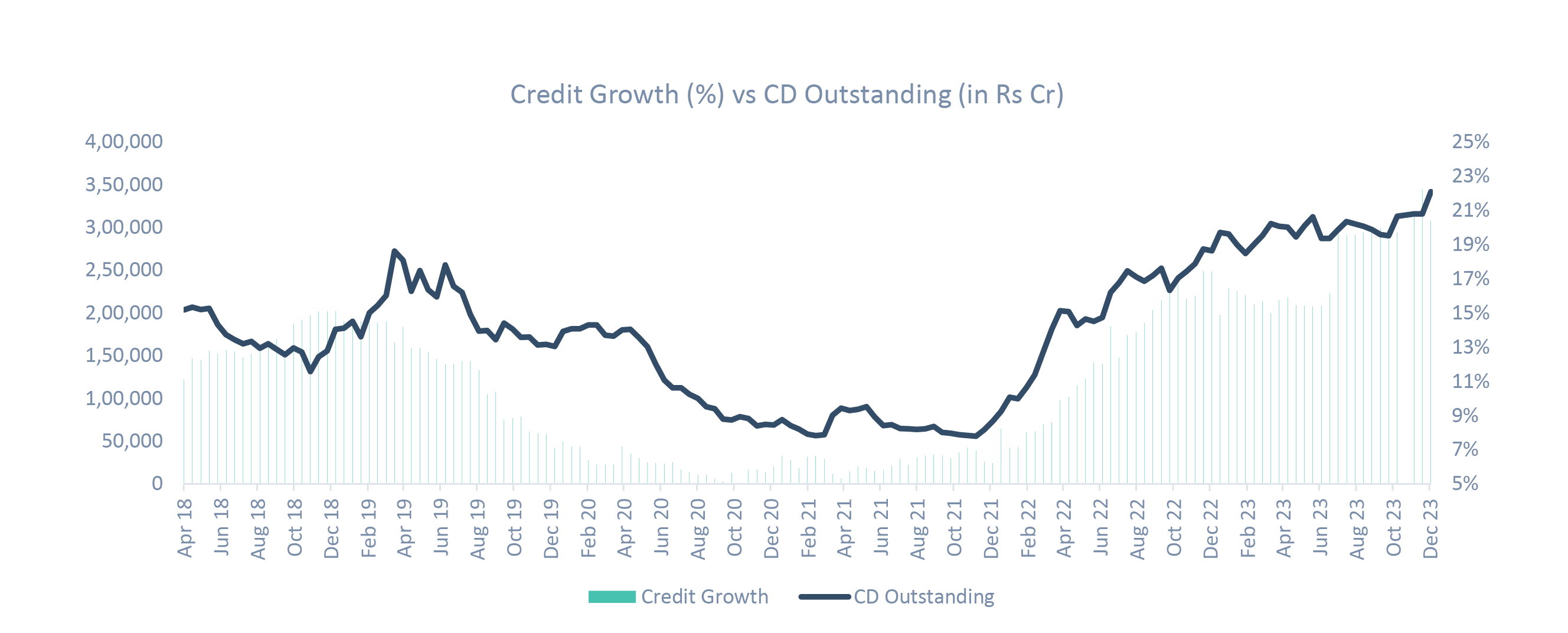 Nearly Rs. 3.4 lac cr. CDs are outstanding; up 17% YoY. 1-year CD rates have moved up to ~7.90% levels