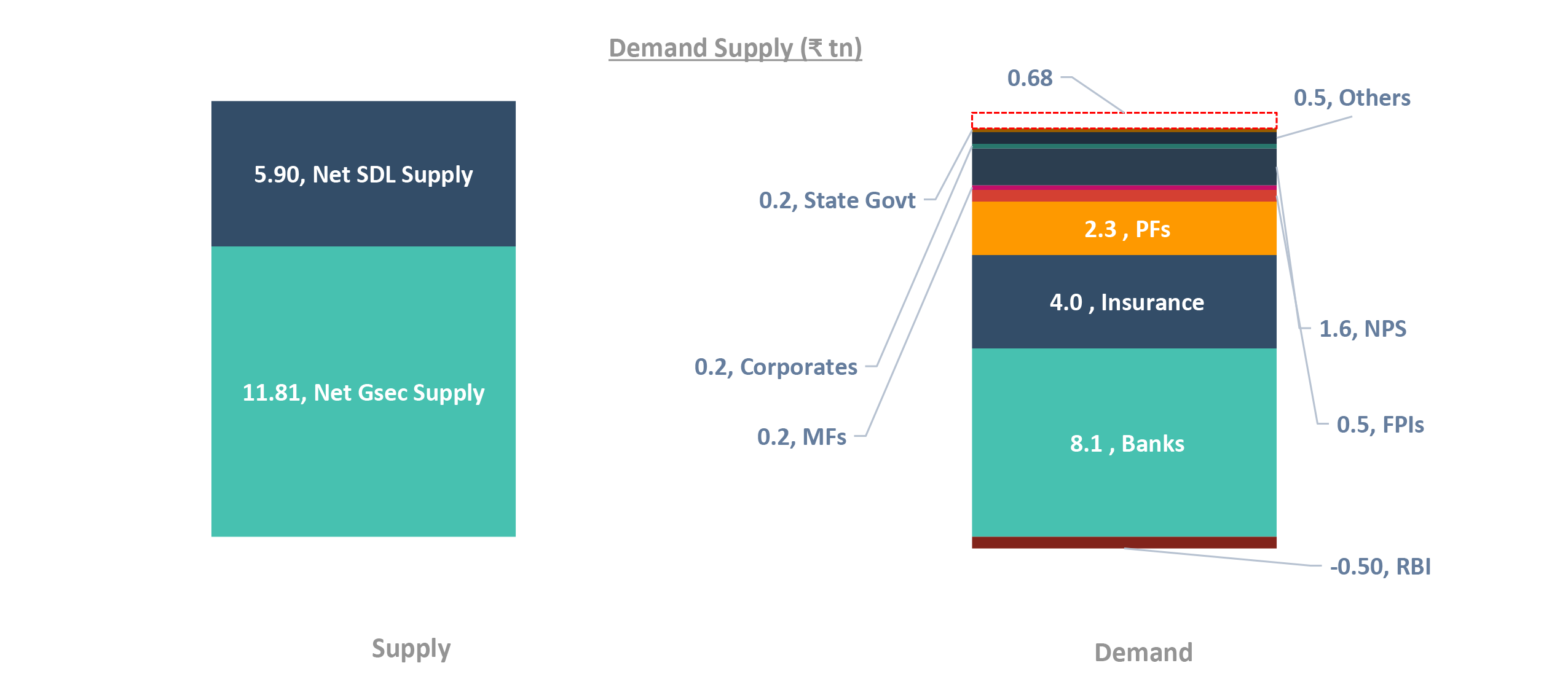 Source – Internal SDL – State Development Loans; PF – Provident Funds; PD – Primary Dealerships; MF – Mutual Funds; FPI – Foreign Portfolio Investors; G-Sec: Government Securities; OMO: Open Market Operations