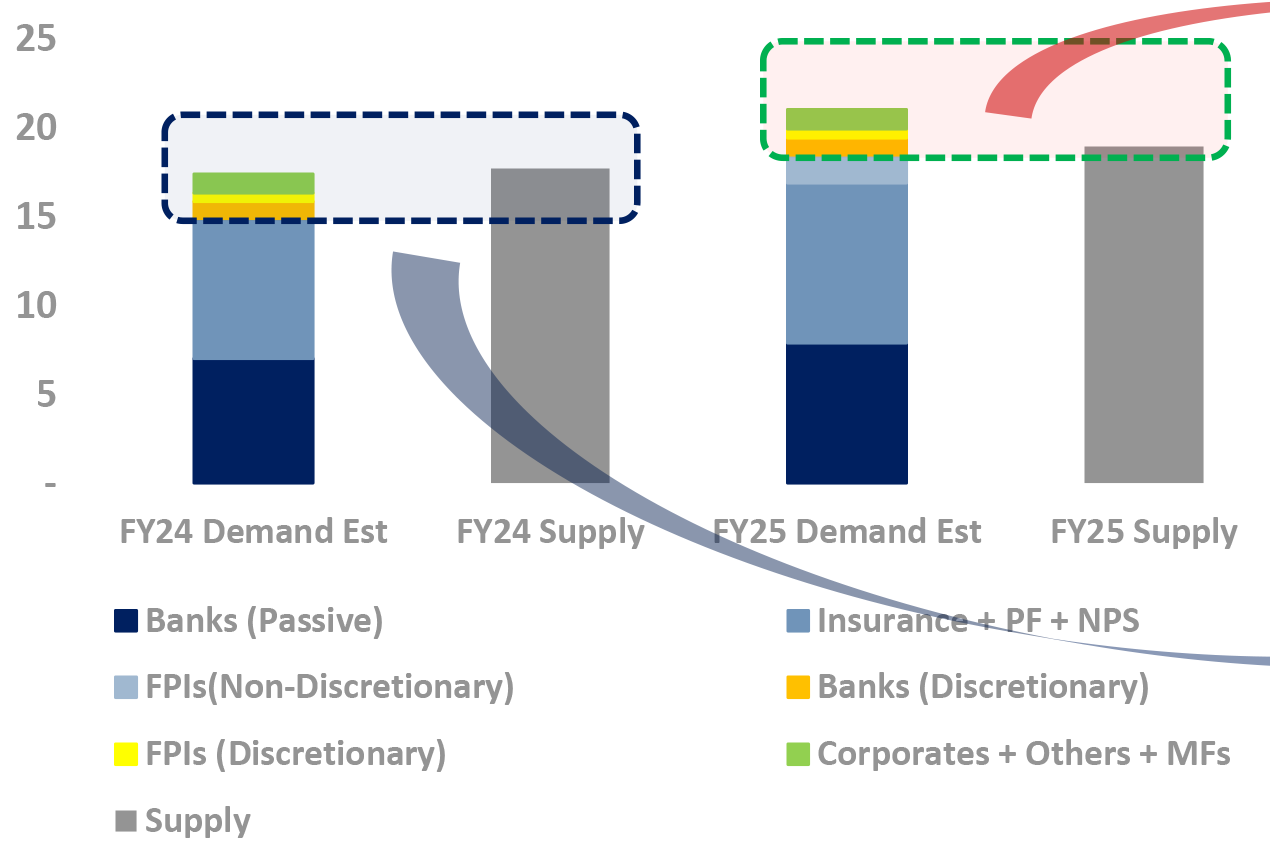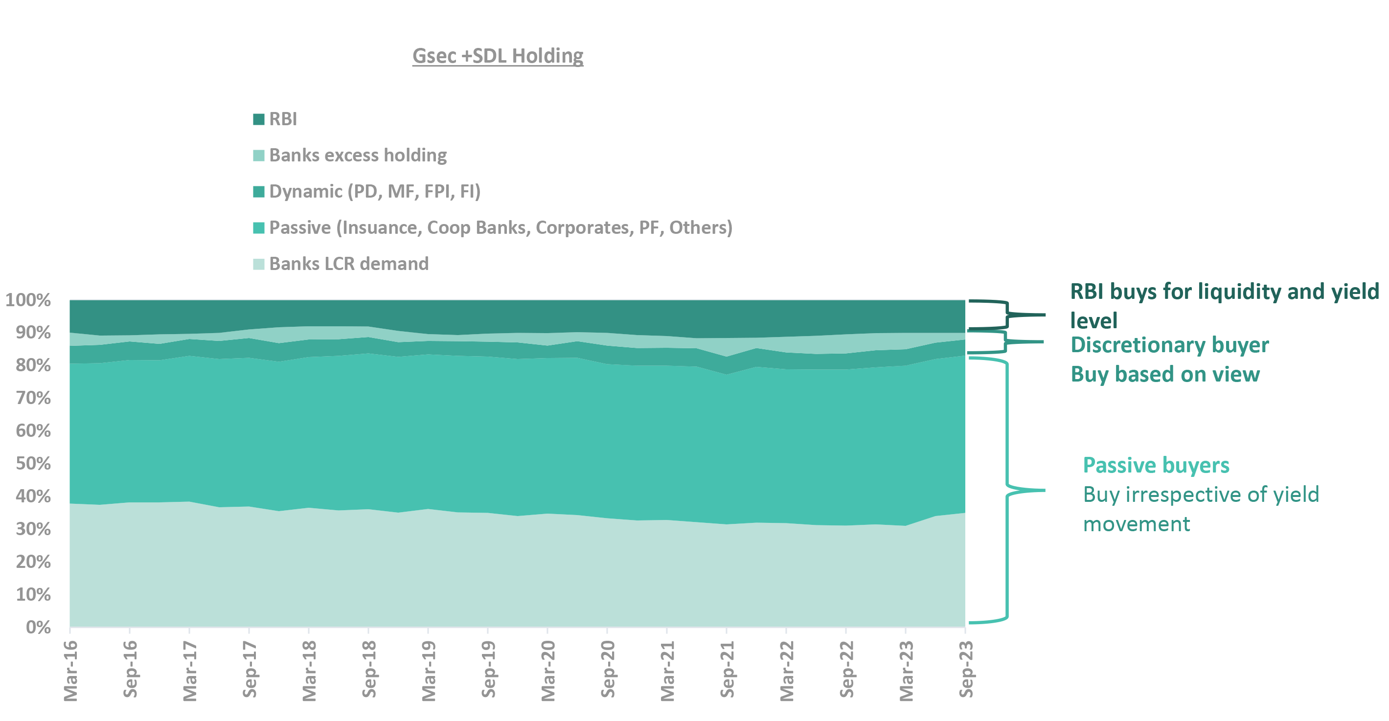 - ✓ Non-discretionary => need to buy for regulation and ALM (Insurance/PF/NPS/Bank-LCR) no matter the yield