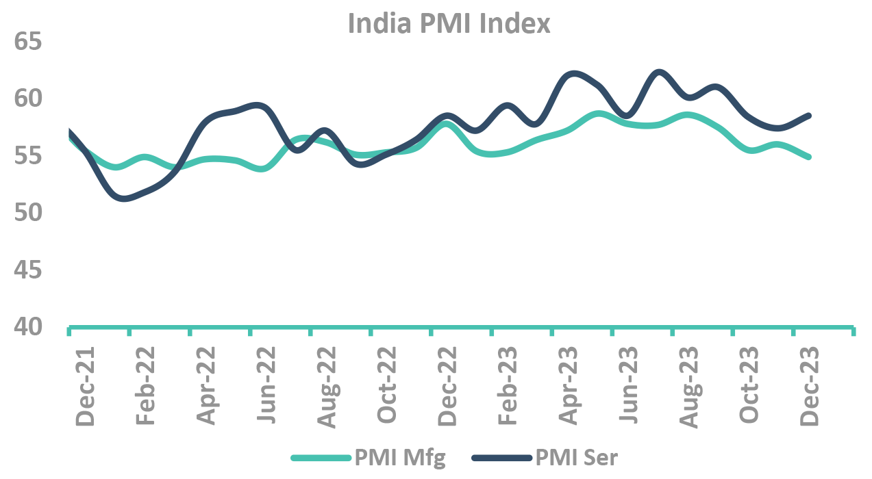 - ✓ Services PMI expanded at faster pace of 58.5 in Dec