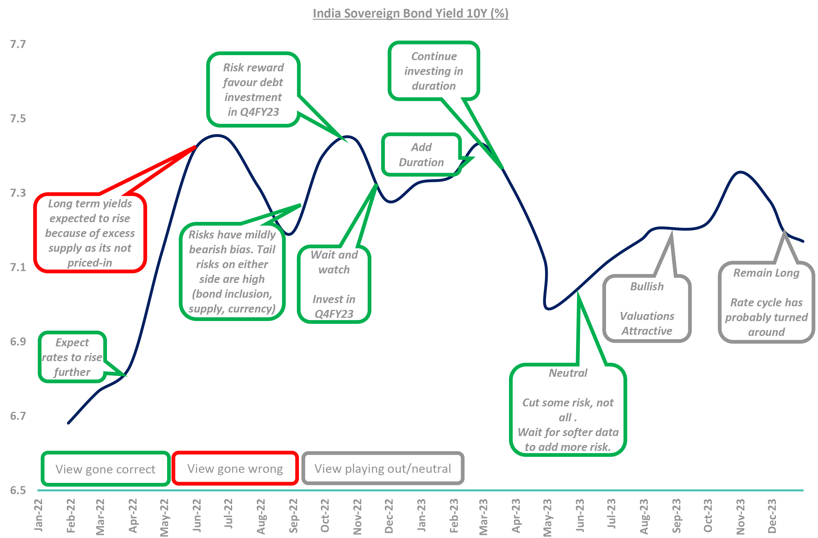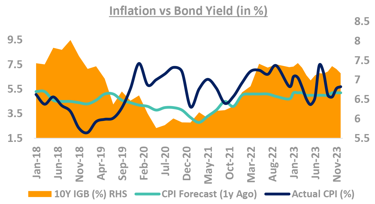 Domestic inflation risks seem contained, with Q3 undershooting RBI projection. However, volatility in CPI has not impacted yields (especially in 2023)