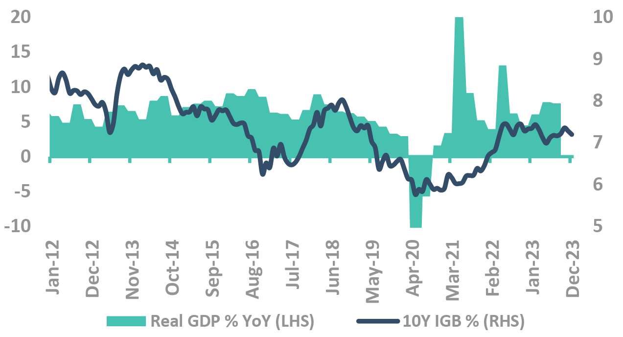 - Yields have usually tracked GDP growth, with correlation stronger when growth slows, barring