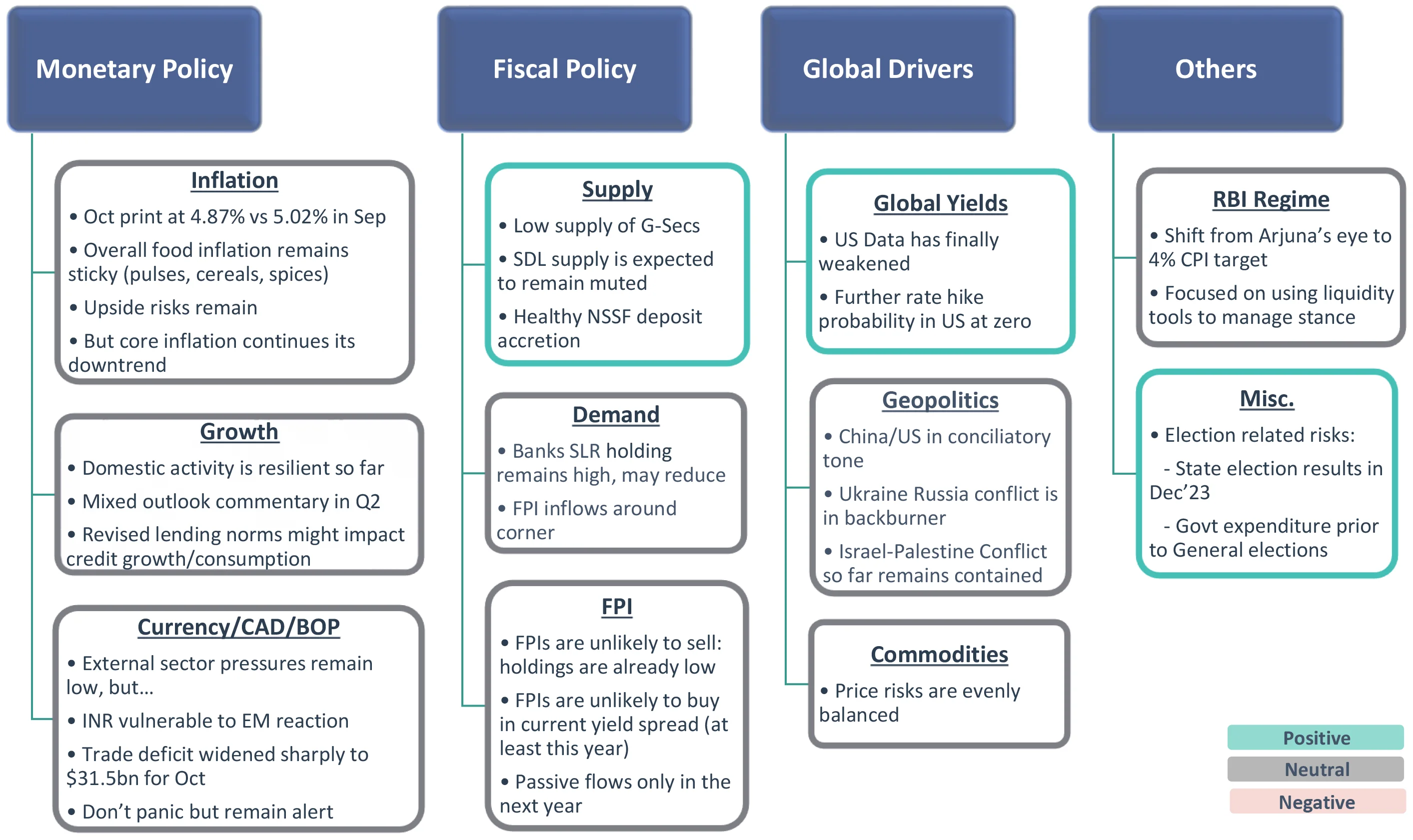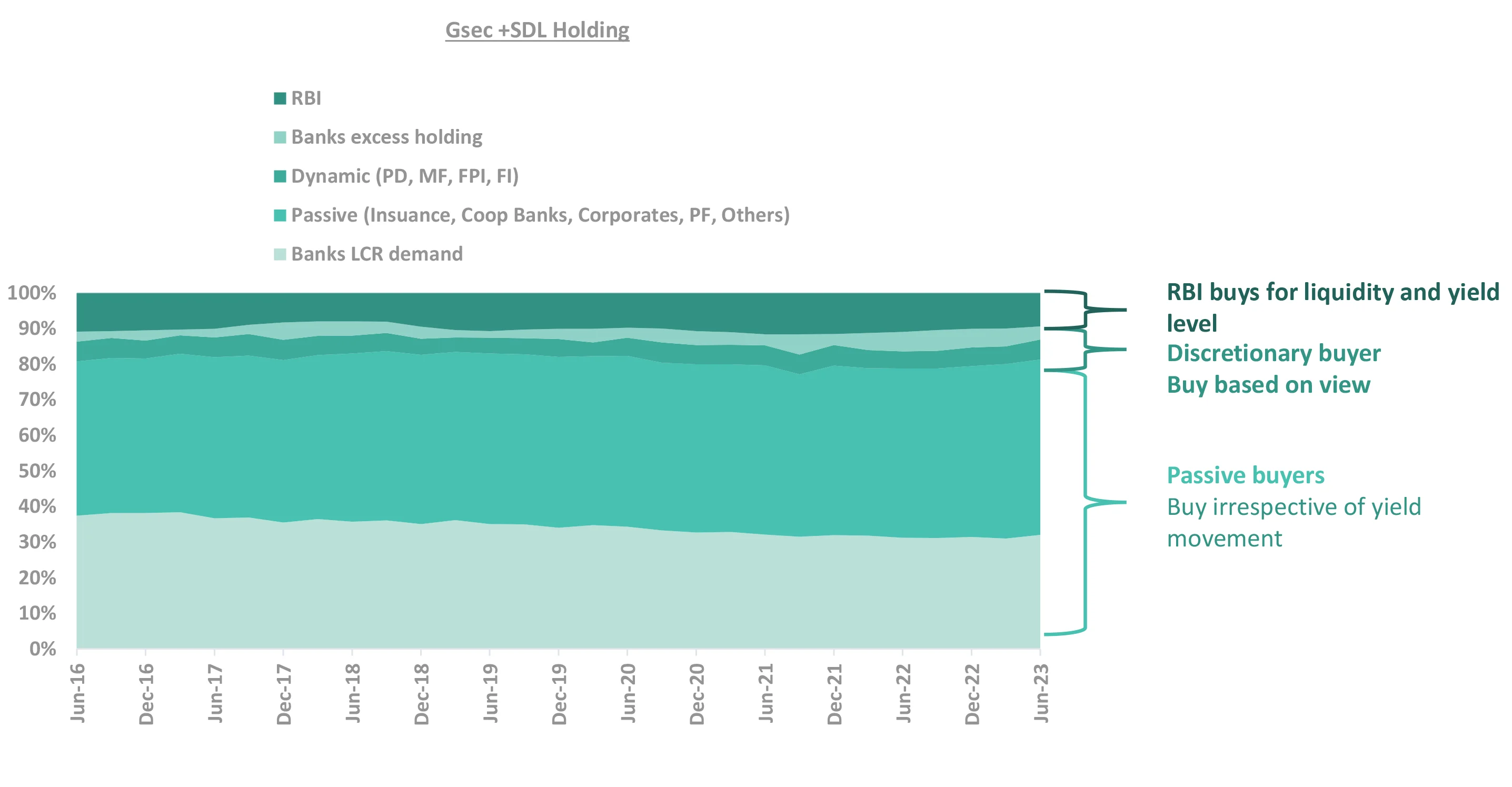 Source – Internal, CGA G-Sec: Government Securities; OMO: Open Market Operation; RBI: Reserve Bank of India; FPI: Foreign Portfolio Investment; NPS: National Pension System; MF: Mutual Fund; SDL: State Development Loans; SLR: Statutory Liquidity Ratio; PF: Provident Fund; EPFO: Employees’ Provident Fund Organisation; NSSF: National Small Savings Fund
