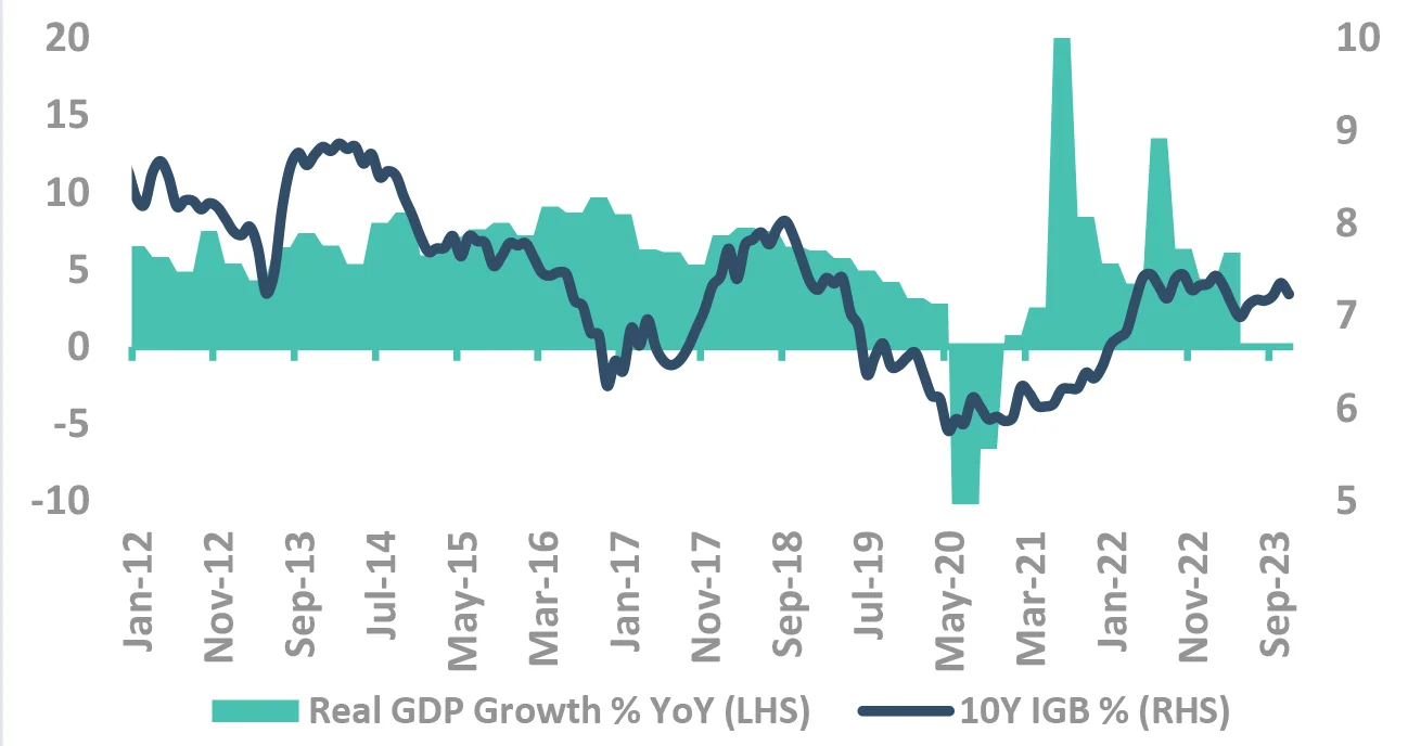 - Yields have usually tracked GDP growth, with correlation being stronger when growth slows, barring