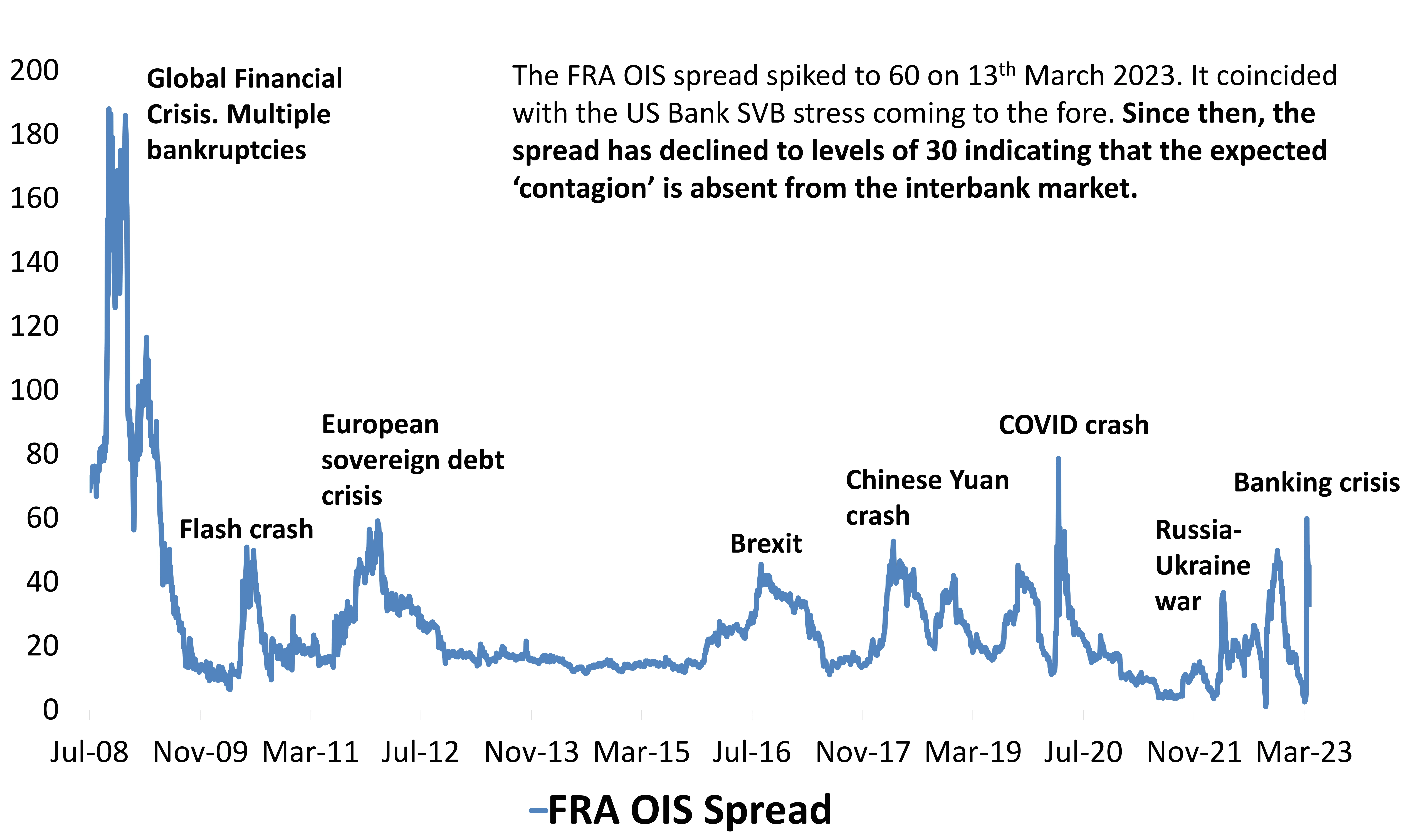 It gives a peek into counterparty confidence in the interbank market. A banking crisis should ideally lead to a loss of confidence and show up here through an elevated FRA-OIS spread.