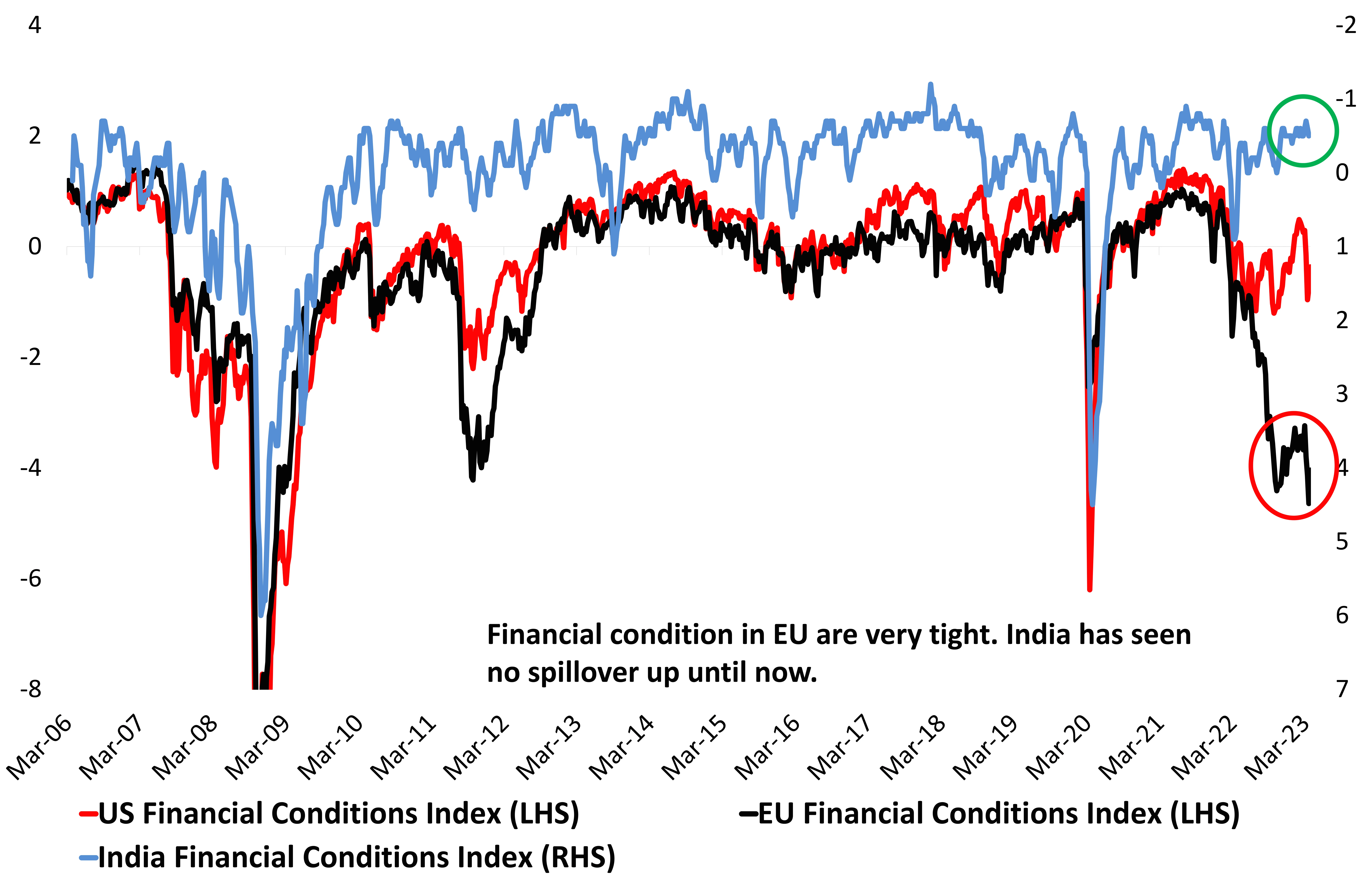 India is still a picture of calm. The financial conditions remain resilient and do not indicate the stress India has gone through historically when the West goes through a crisis.