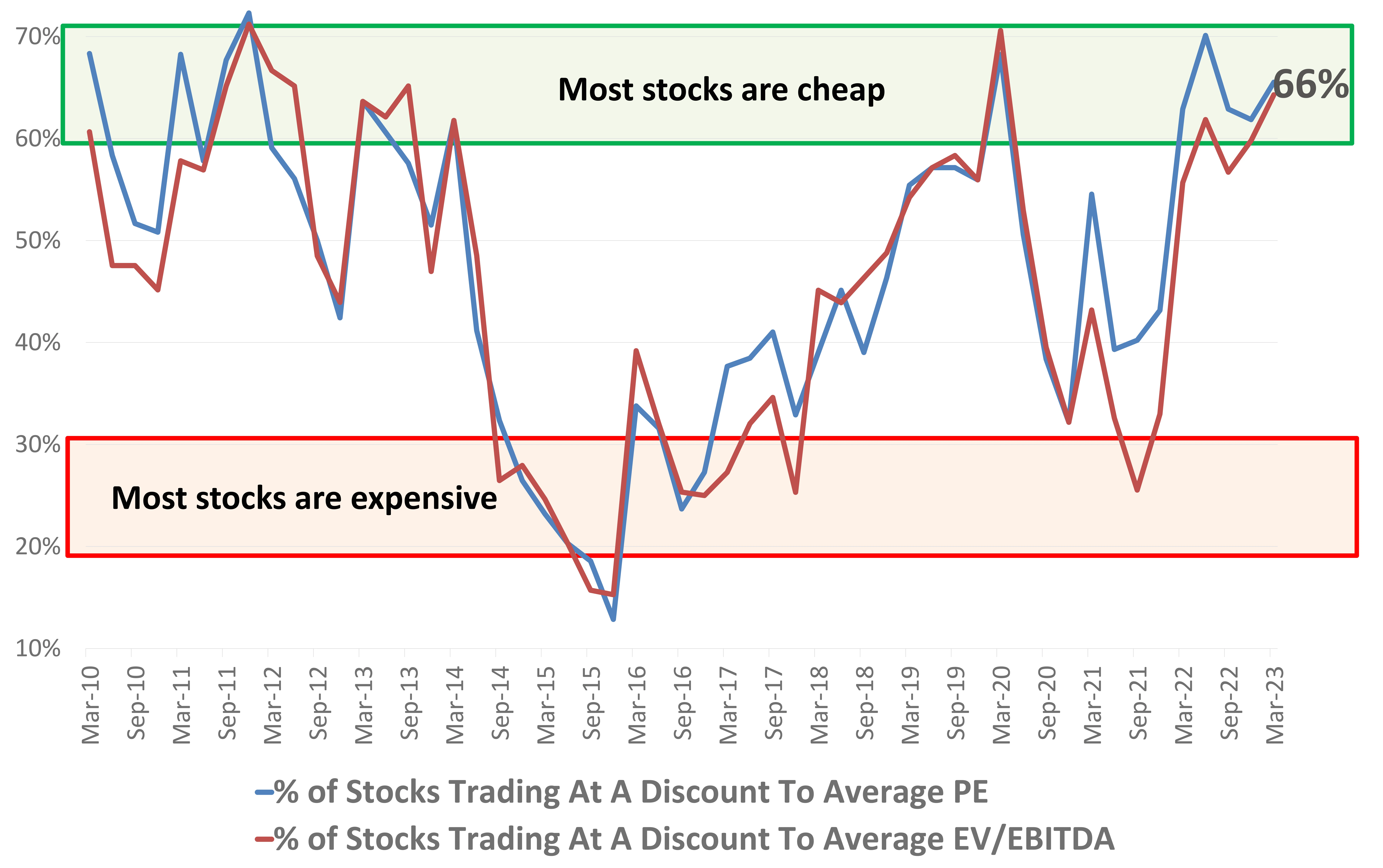 Two third of the universe is trading below their past 13-year average Price to earnings & nearly similar number of companies are trading below their historical EV/EBITDA multiples.