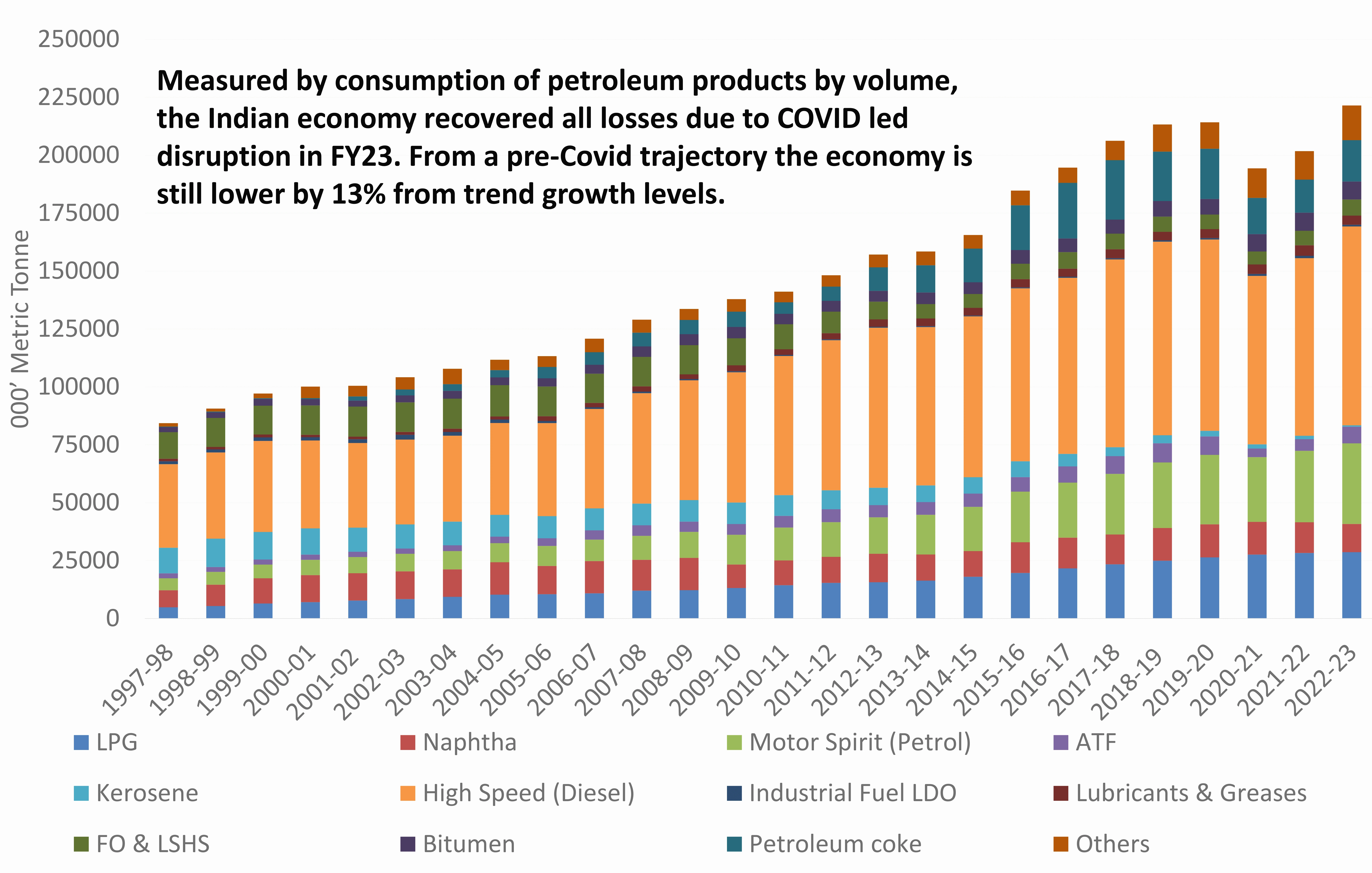 However, when measured from a pre-COVID growth trajectory, the economic growth, measured by quantity of petroleum products consumed is still lower by 13% in comparison to its trend growth if COVID hadn’t happened.