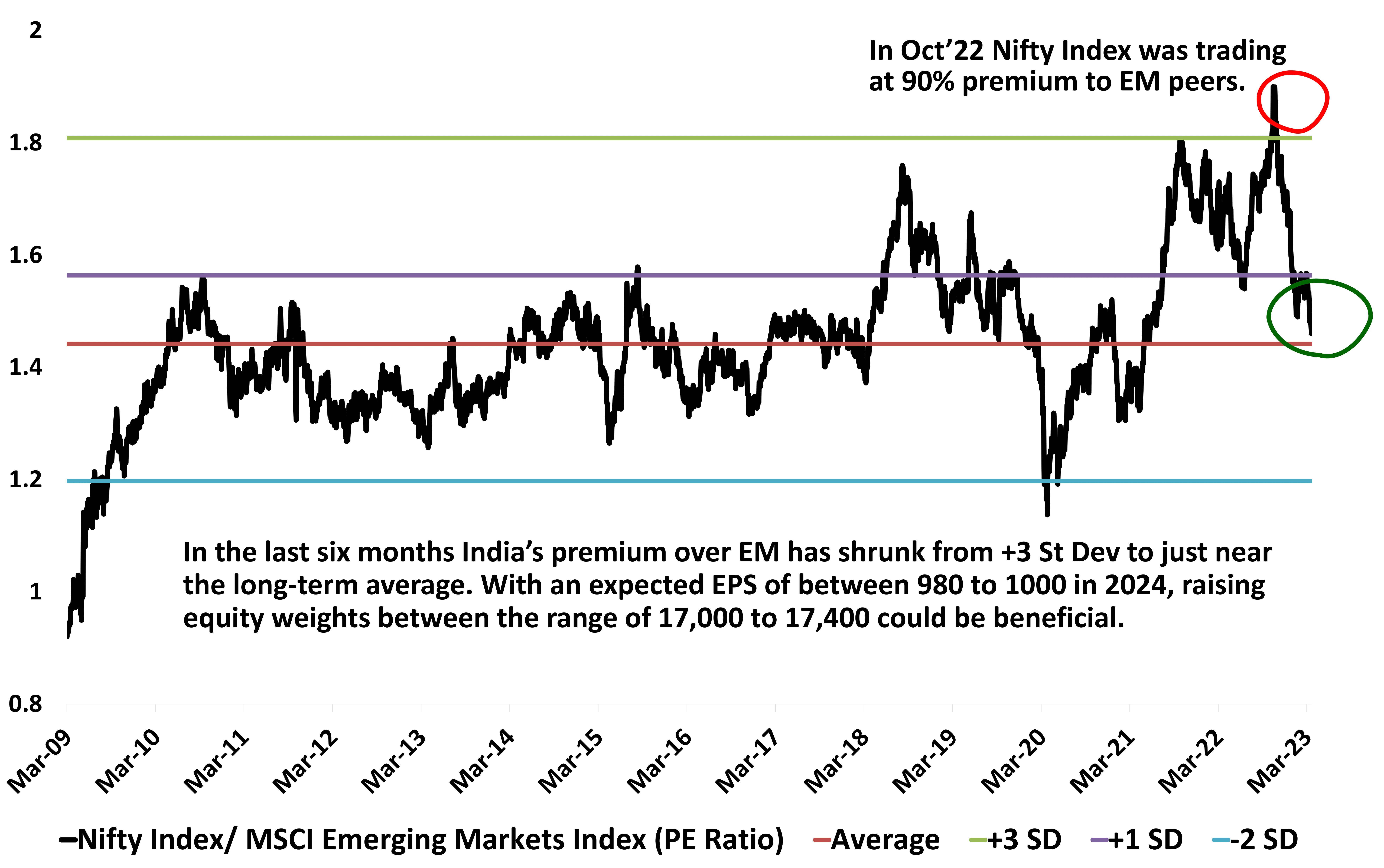 The Nifty Index is now trading at valuations close to its long-term average versus the emerging markets.