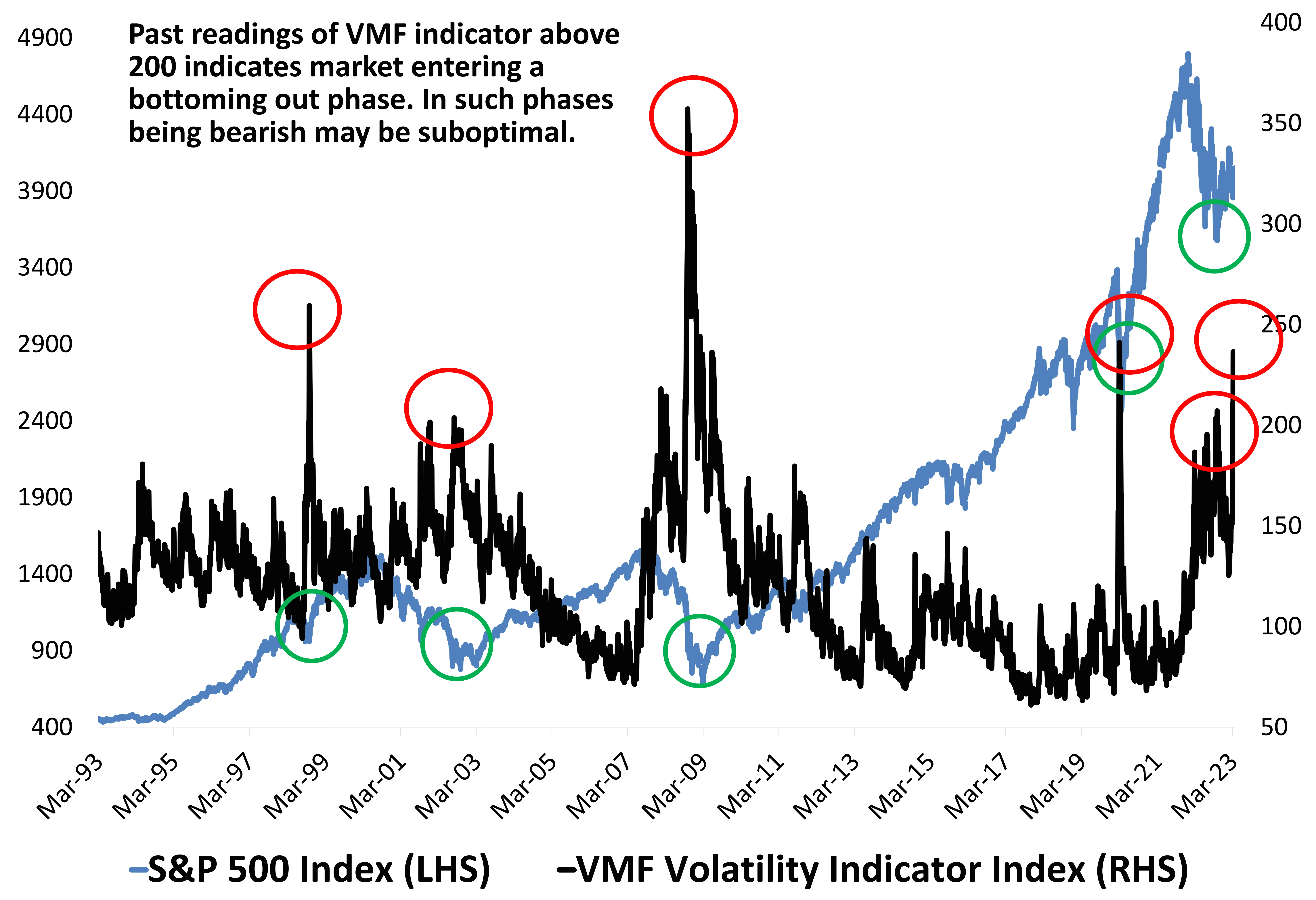 Currently, we are witnessing heightened readings across all the three underlying indices of these asset classes. In the first week of Oct’22, this indicator reached a level which signaled the possibility of a bottoming out process in markets. During the March’23 banking crisis the indicator once again spiked and has begun to cool off. The ‘Risk-off’ has run too far.