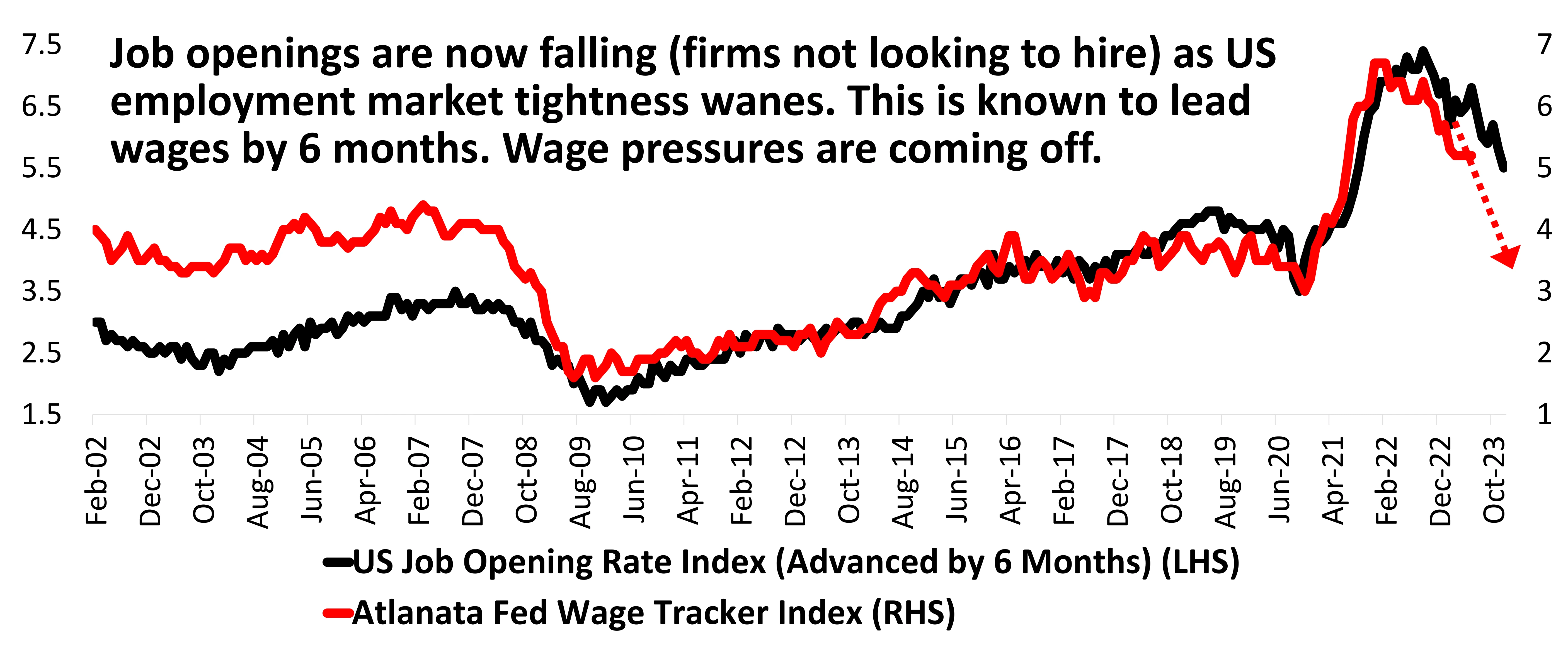 This opens an opportunity to buy US treasury bonds as inflation slows further and Fed begins to embark on a cycle of rate cuts later in the year. The ideal entry point could be closer to US T10 yr at 4.25% to 4.40%.