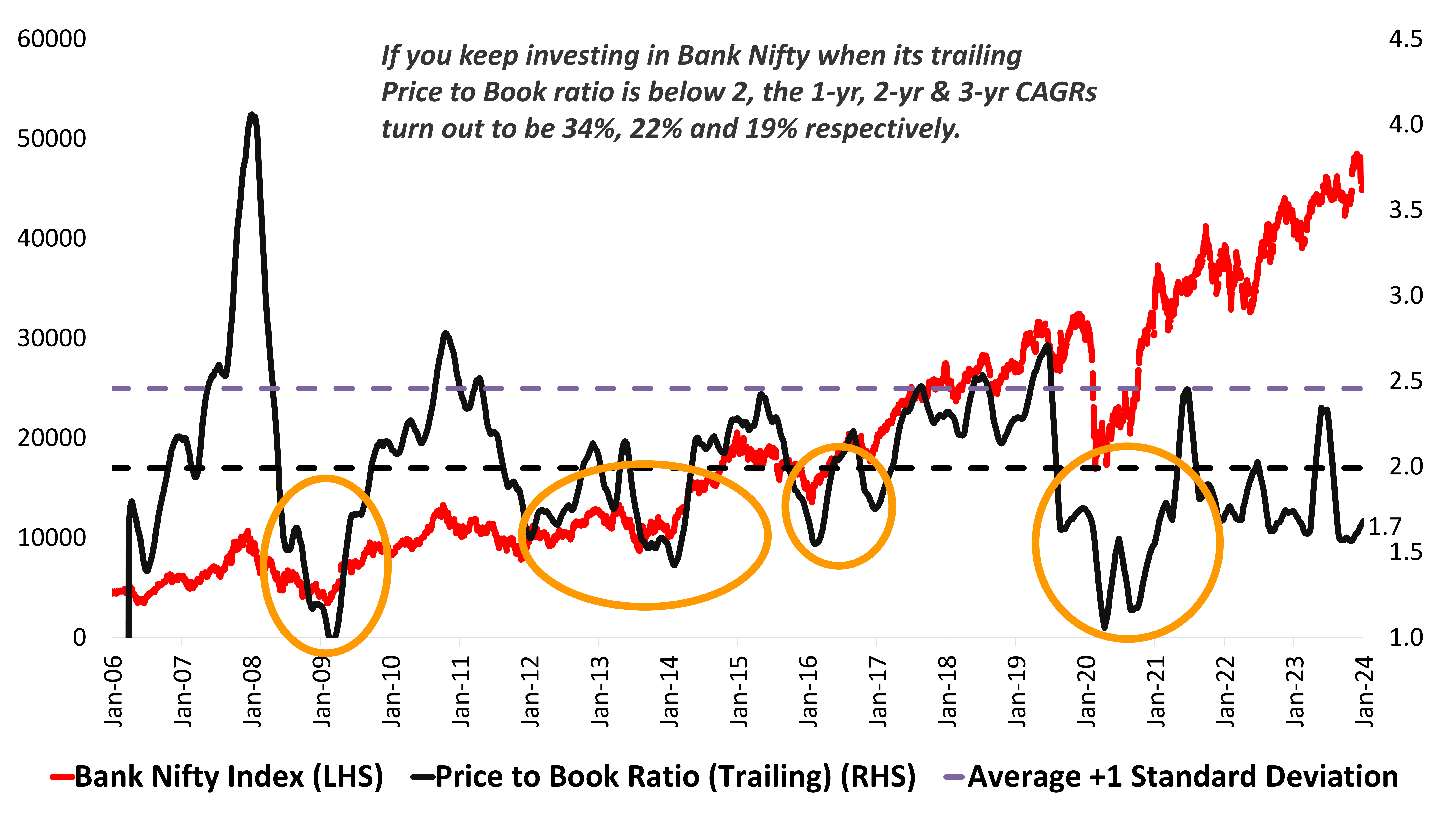 As measured by Price to Book Value ratio (P/B), the Nifty Bank Index traded below 2X P/B in Jan 2024. Historically, if you were to keep investing in the Nifty Bank Index during periods when its P/B is below 2 times, it delivers exciting returns over the next few years.
