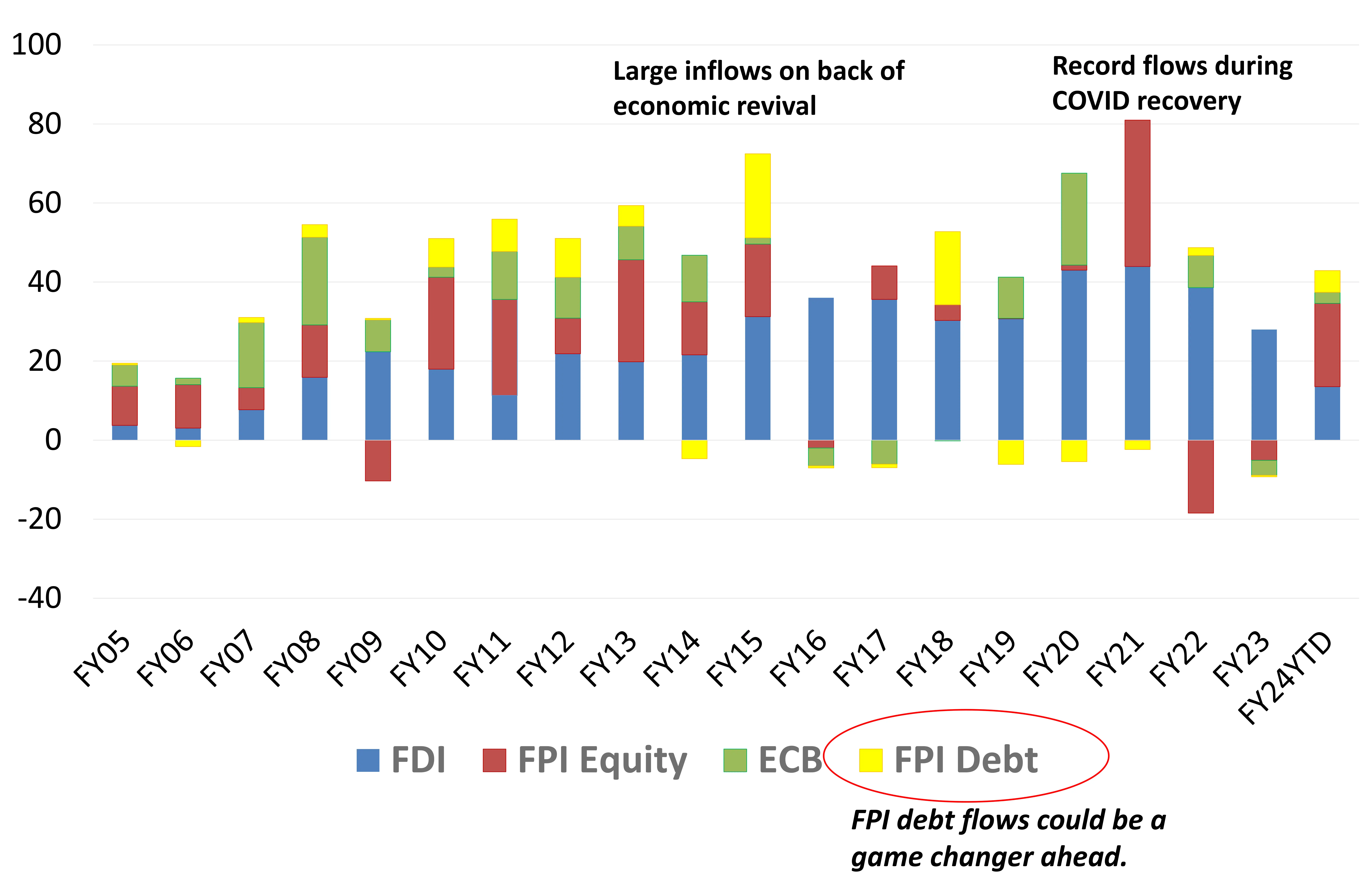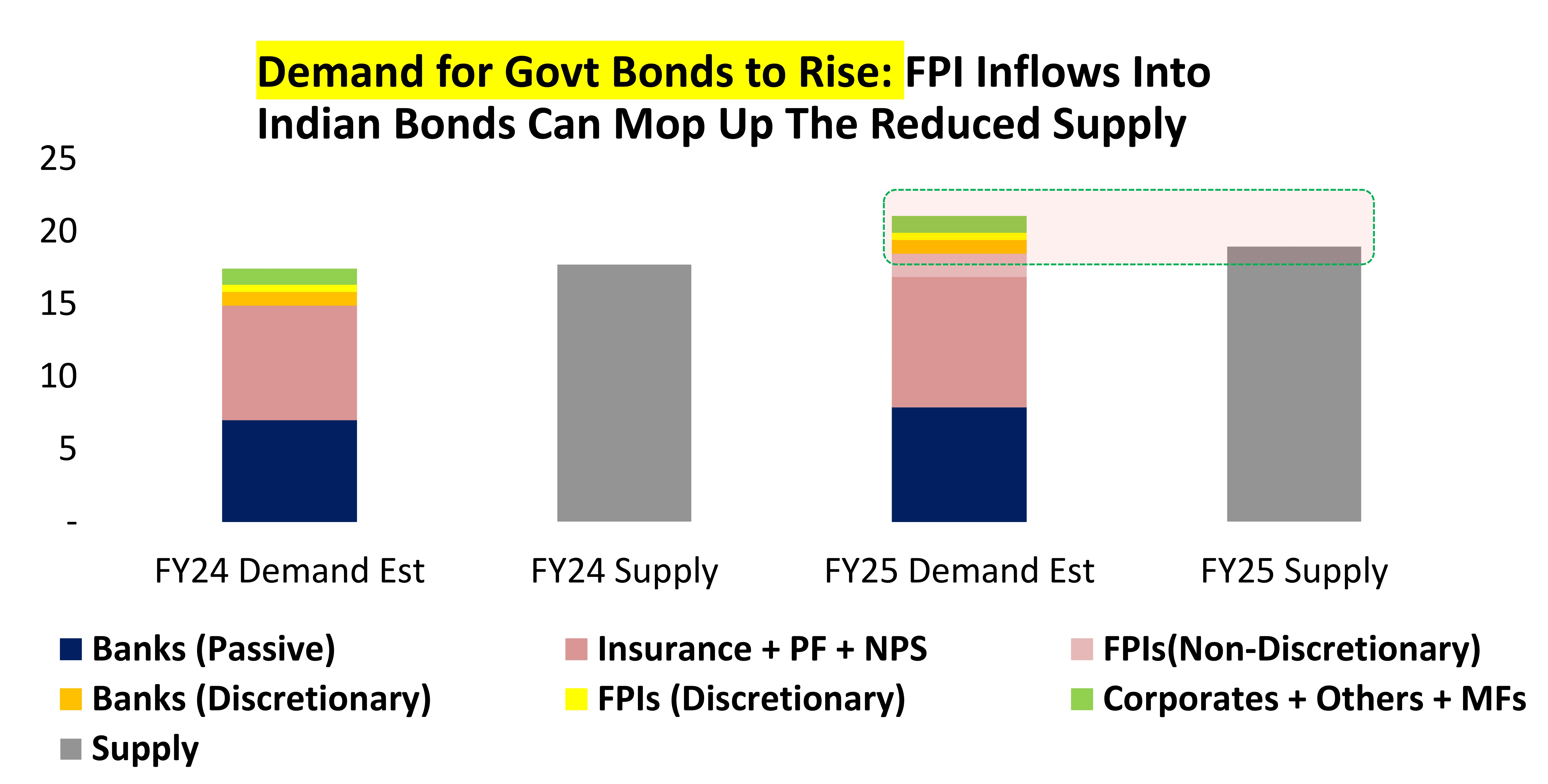 FPI debt flows are likely to pick up as India becomes the part of global bond indices. An opportunity to benefit from this trend may present itself in FY25 onwards by participating in long duration Govt. Securities in India. India is likely to receive $25bn in FPI inflows as it become the part of global bond indices. This can be a game changer for one category of debt funds. Funds which have bondsfor long maturity. Duration.