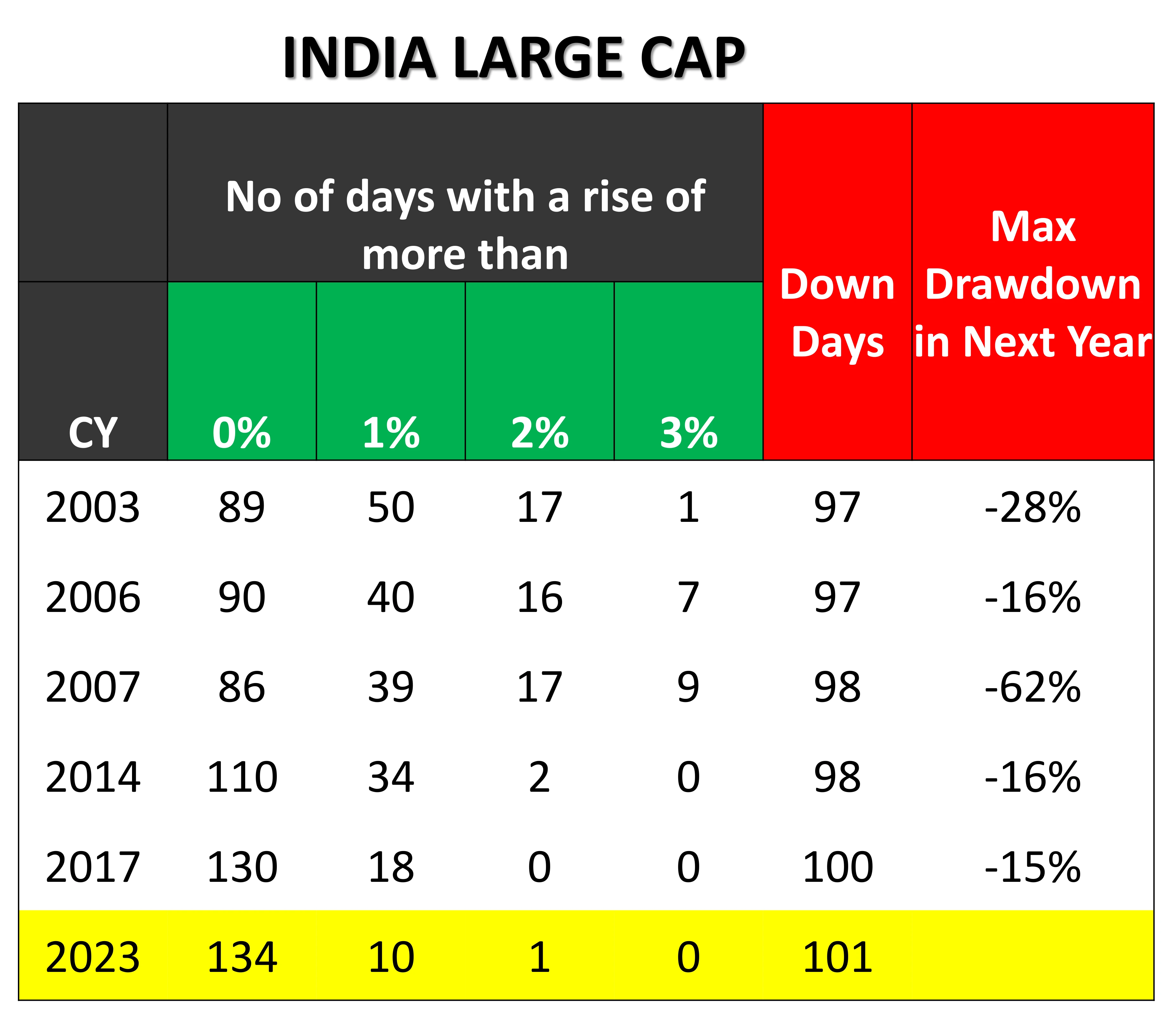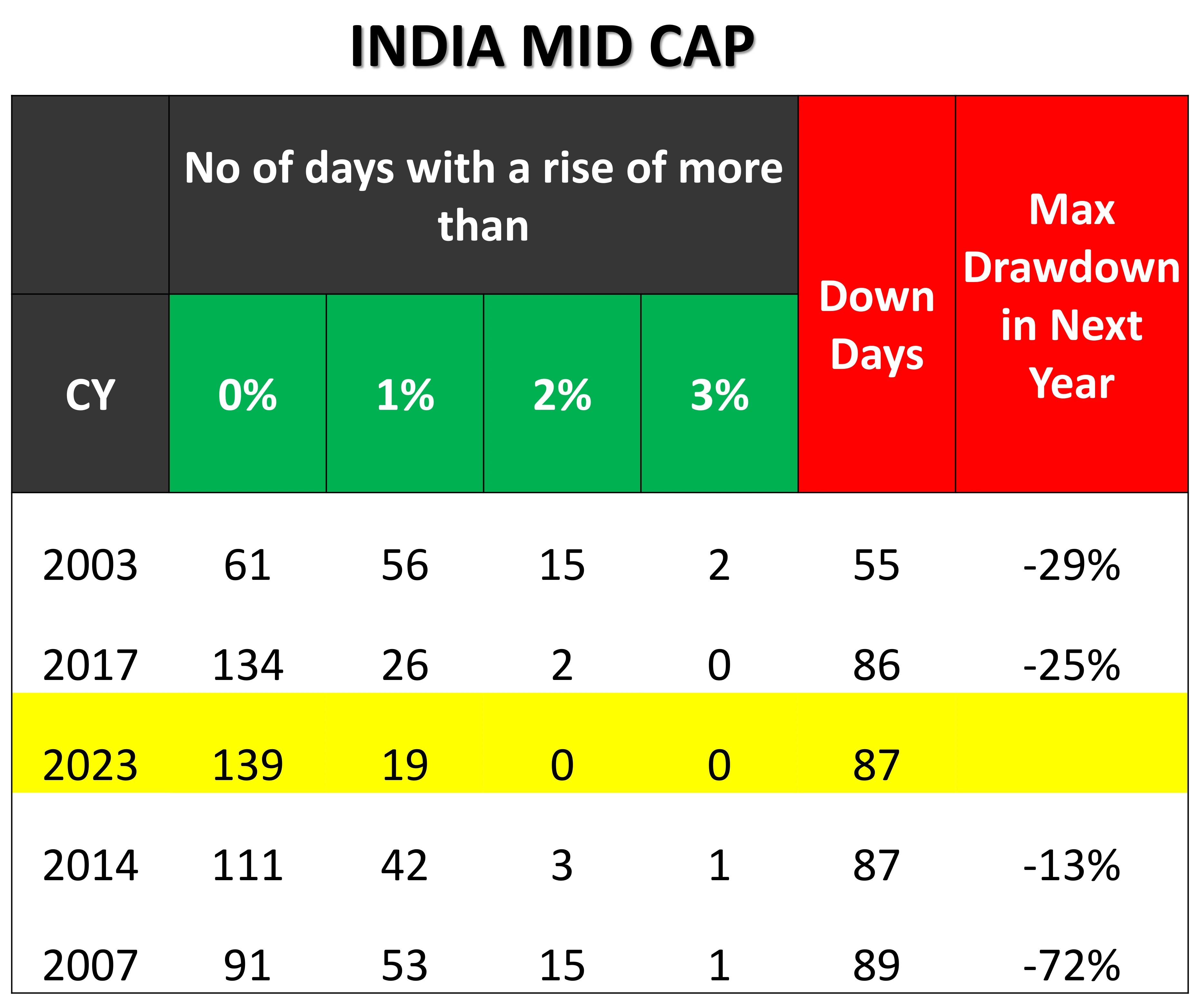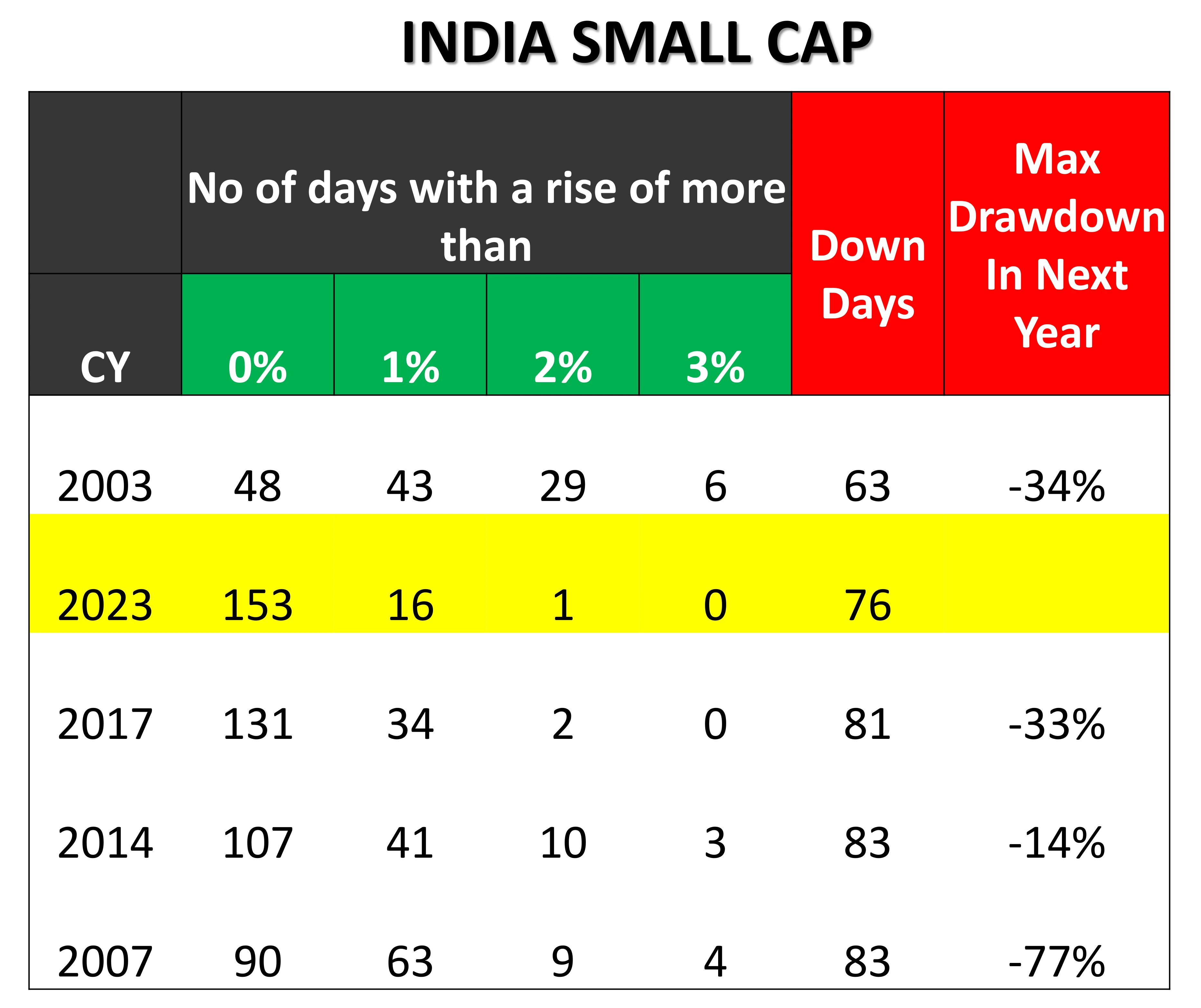 The number of days the Small & Midcap indices have risen by 1% or more neared previous best years in 2023. Such broad, ‘all boats sailing’ uptrend years are rare. In the past, such years have been followed by more than average drawdowns in the following year.