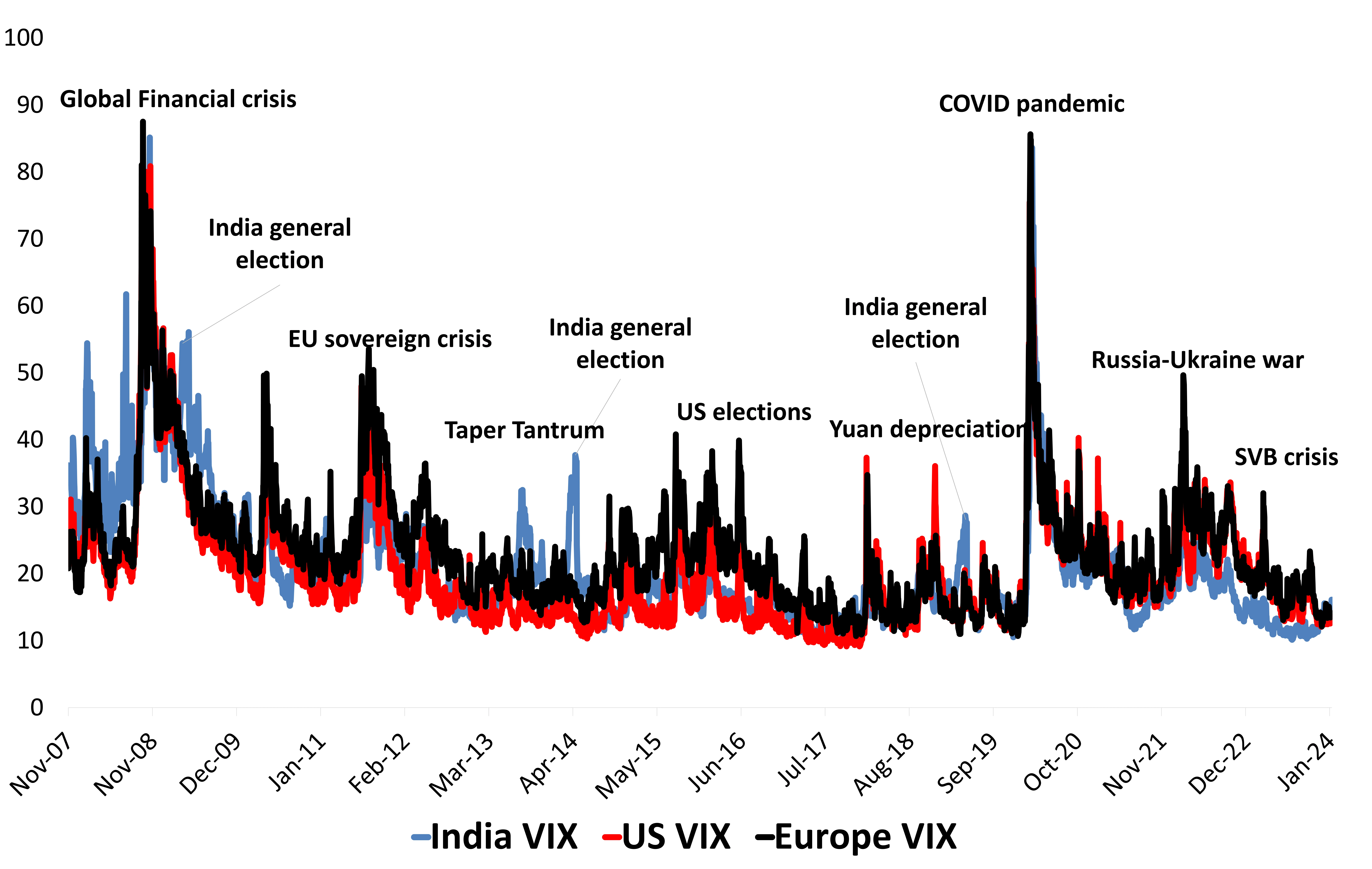 Volatility readings across the world are subdued. Nearly half the world population is going to vote in the next 11 months which will introduce a lot of uncertainty from a policy making standpoint. Historically this has been a source of heightened price swings.