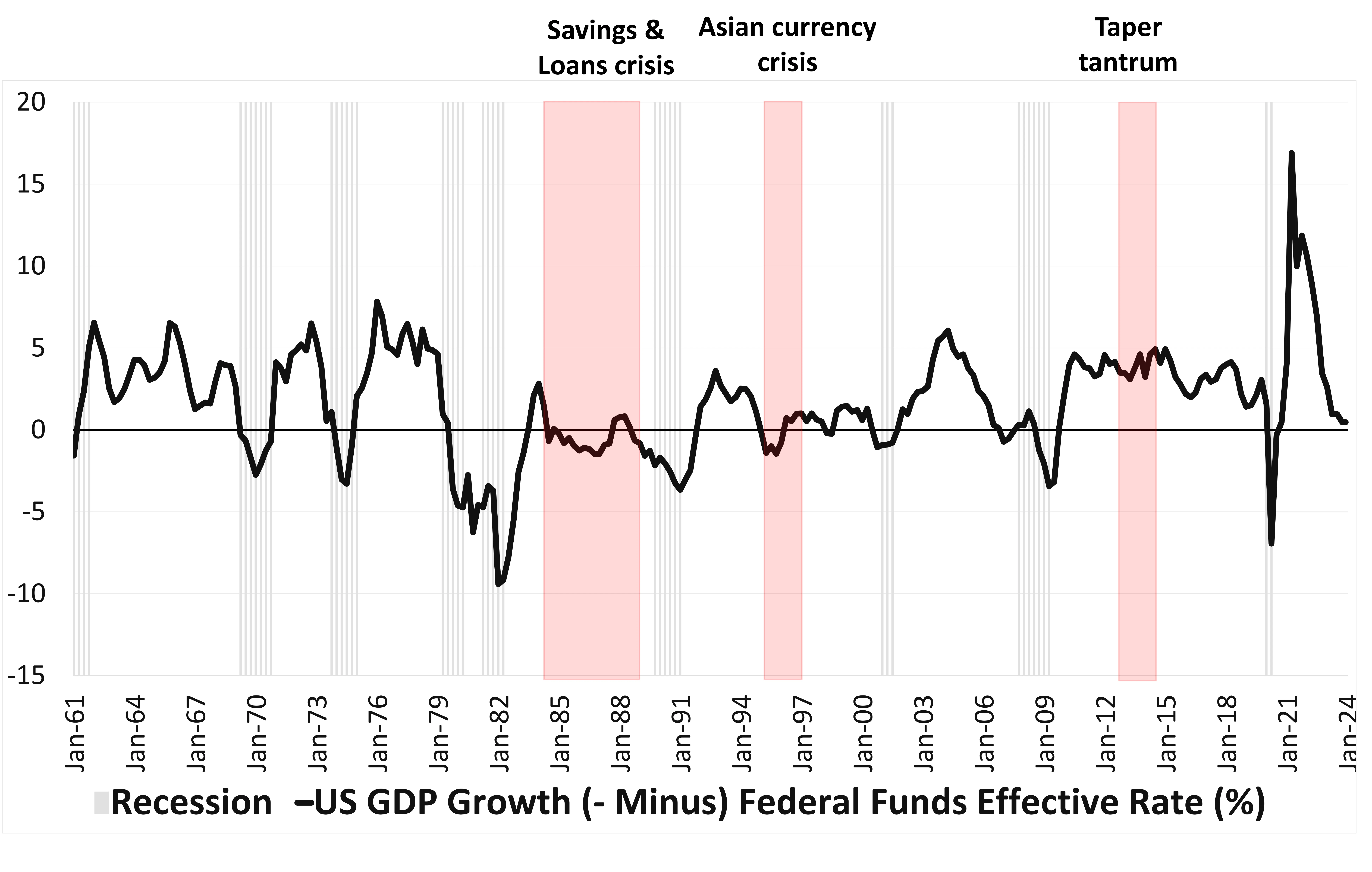 Historically, whenever the US Fed raises rates such that the Federal Funds effective rate is higher than the nominal GDP growth rates (yoy), a slowdown ensues.