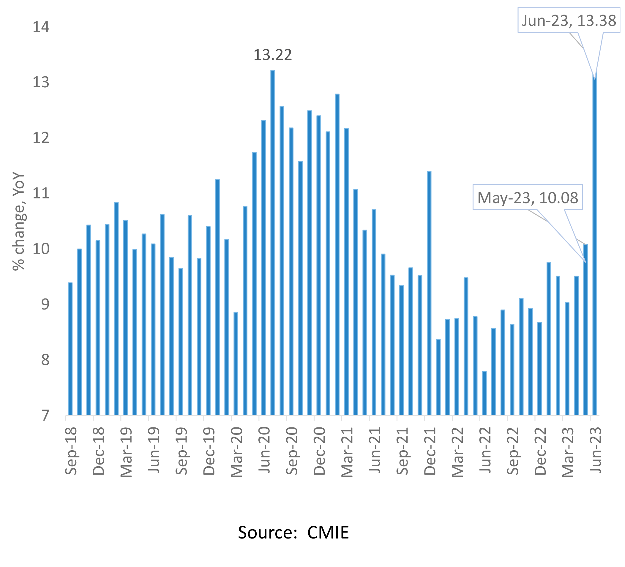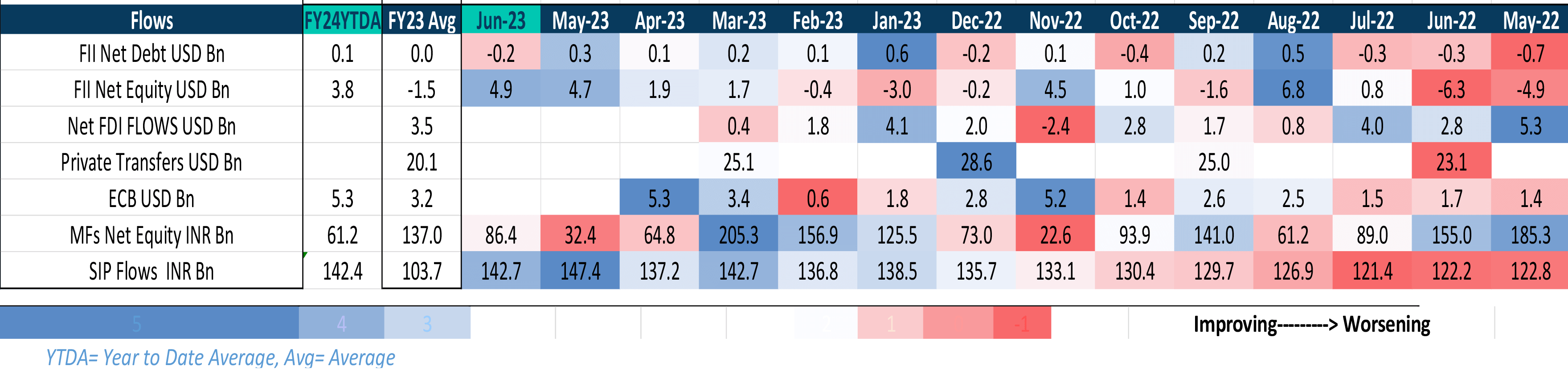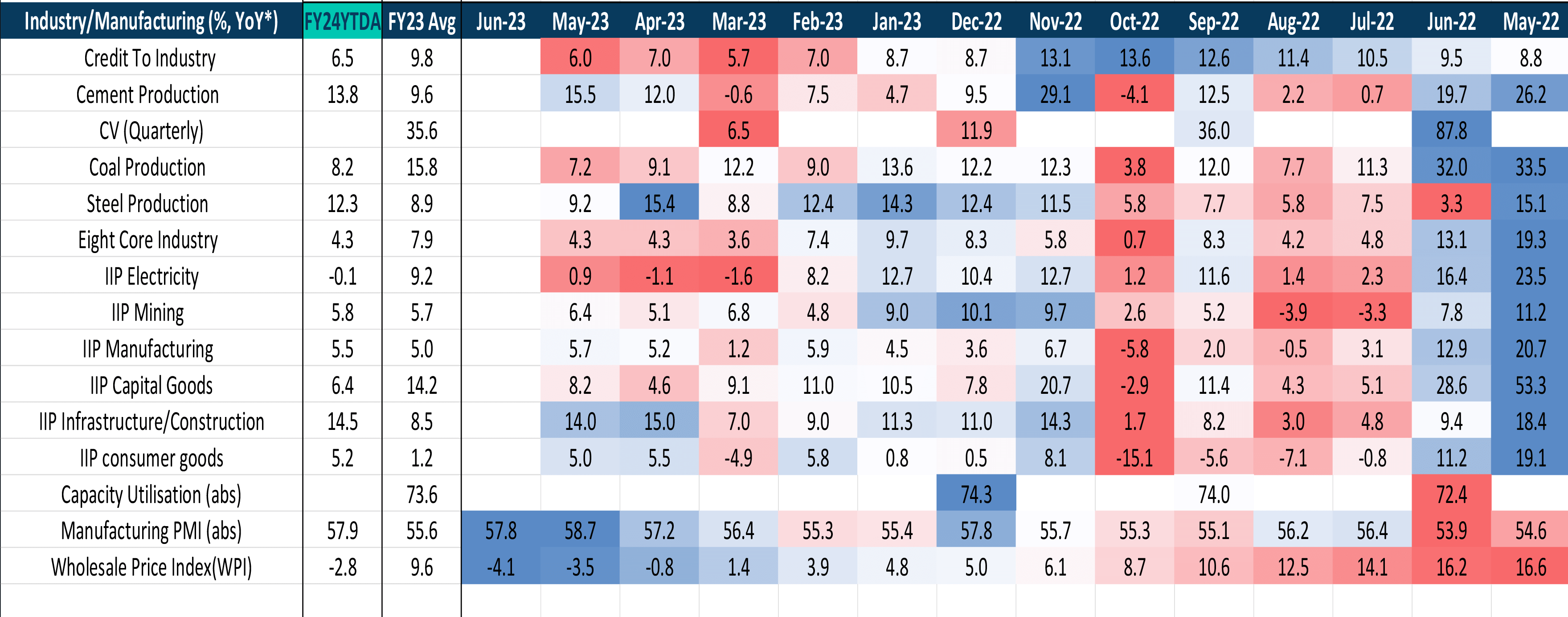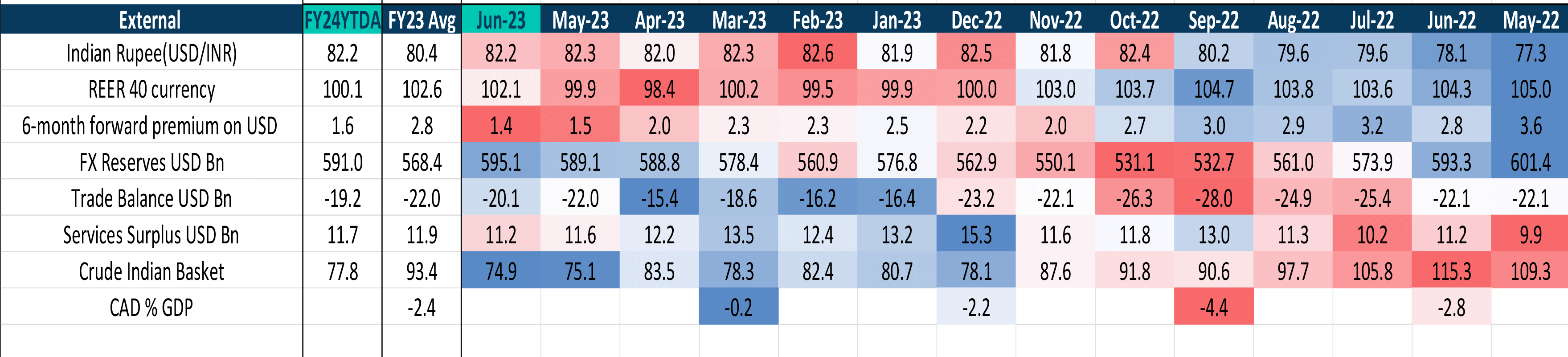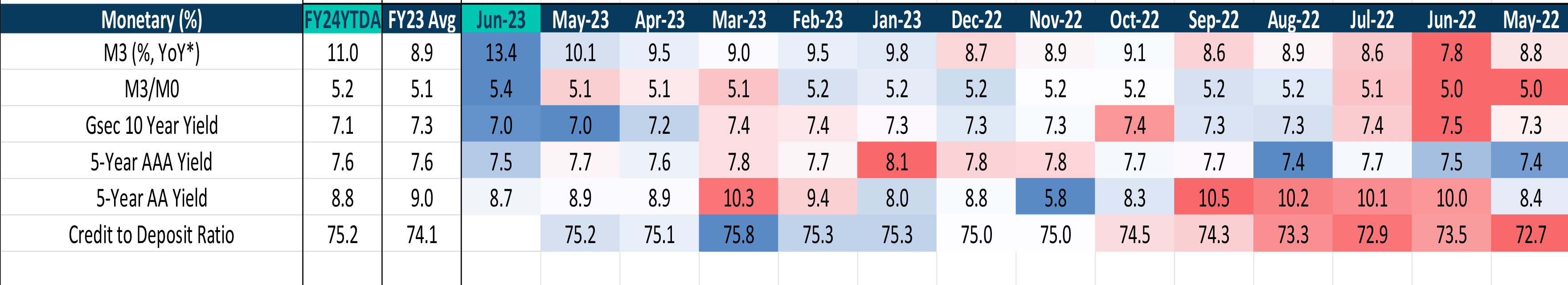 The prevailing money supply has surpassed the peak recorded in July’20 of 13.2%. This development serves to reinforce the notion that the current monetary policy is notably less restrictive in nature. 10-year Gsec yields have remained stable, after easing from highs. A fall in risk premia is reflected in lower corporate bond yields.
